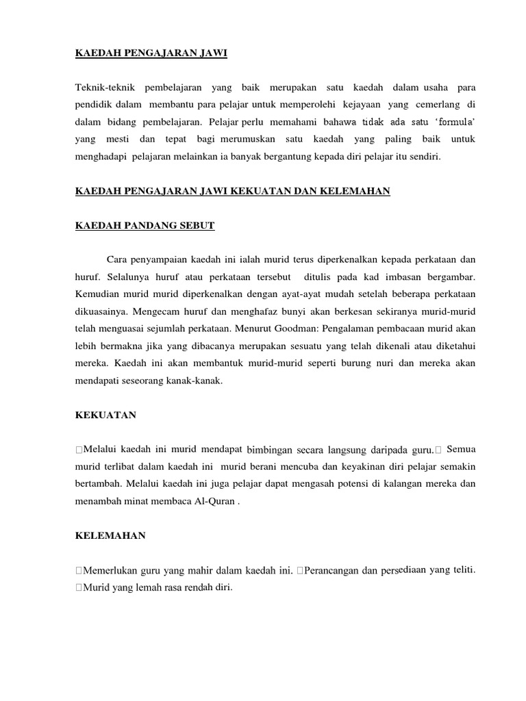 Tanggapan sebegitu kurang tepat. 7-10 strategi pengajaran dapat dilaksanakan melalui beberapa pendekatan iaitu pendekatan yang berpusatkan murid kepelbagaian teknik kepelbagaian sumber bahan penggunaan tatabahasa yang tepat pengajaran yang bertema penyerapan bacaan luas penggabungjalinan penilaian pemulihan dan. Anak pula tidak akan bosan belajar membaca Jawi kerana bahan pengajarannya yang pelbagai.