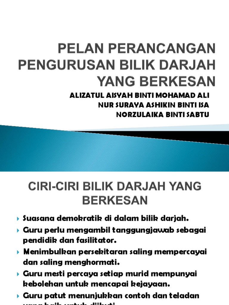 Konsep pengurusan bilik darjah berkesan. Pengurusan bilik darjah yang berkesan. Seterusnya pengurusan bilik darjah yang berkesan menggalakkan daya pemikiran kreatif yang tinggi di kalangan murid. Murid berasa tenang seronok dan bermotivasi untuk belajar.